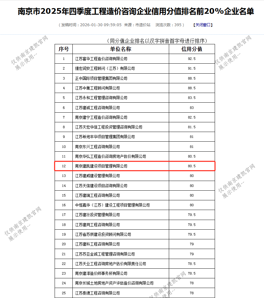 恭喜我司入選“南京市2025年四季度工程造價(jià)咨詢企業(yè)信用分值排名前20%企業(yè)名單”
